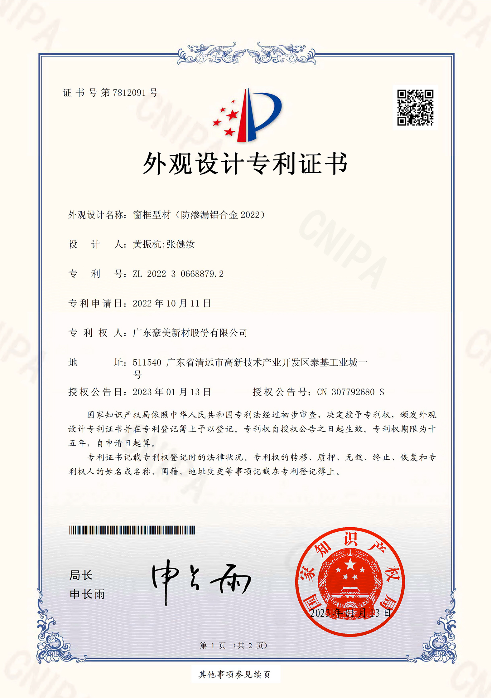 ZL 2022 3 0671562.4 鋁合金窗框型材(光企和勾企執(zhí)手2022)
